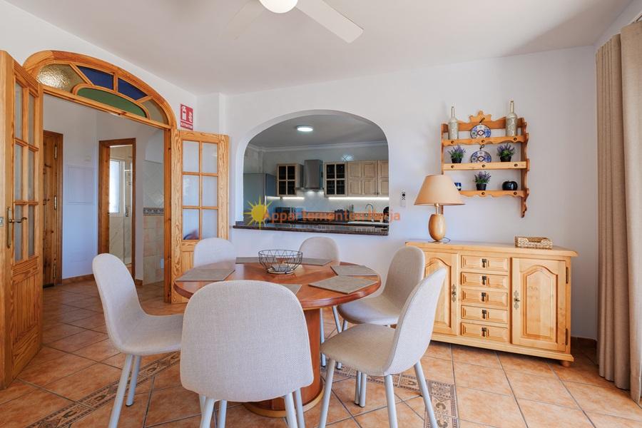 Huset er fordelt på to etager. Hovedindgangen er i gadeplan og har en stor privat parkeringsplads, der kan rumme en stor bil og flere motorcykler. Når vi kommer ind i huset, finder vi en entré, et komplet badeværelse med bruser, et fuldt udstyret køkken med nye apparater og direkte adgang til en stor terrasse med havudsigt. Stuen/spisestuen, meget lys og med pejs, åbner også ud til denne terrasse, ideel til at nyde udsigten og det gode vejr hele året rundt.