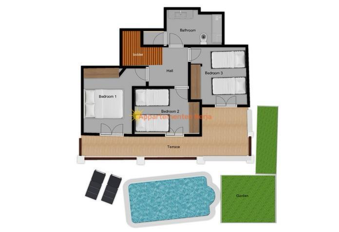 Den nederste etage består af tre soveværelser, alle med indbyggede skabe og varm/kold aircondition. Fra hver enkelt har du direkte adgang til haven med naturligt græs, frugttræer (såsom avocado-, citron-, appelsin-, figen- og banantræer) og det private poolområde. På denne etage er der også en hall og et andet badeværelse med bruser.