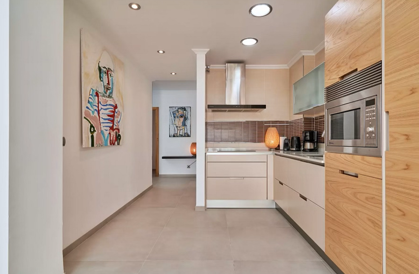 Cozy living room with open kitchen and sea view. Sitting area with sofa, TV with international channels, sports and film, fiber optic internet, air conditioning and a dining area for 4 people. Sliding doors to the spacious terrace with beautiful views over Playa Burriana and the Mediterranean Sea. On occasion, you can see schools of dolphins passing by.
