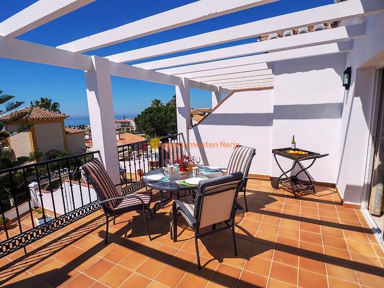 This beautiful villa in Nerja, southern Spain is bright and has several terraces with breathtaking sea and mountain views. The villa has a private swimming pool and is a 10-minute walk from the cozy Burriana beach with its many restaurants, bars and terraces. This holiday home is perfectly located for a wonderful beach holiday in Nerja on the Costa del Sol.