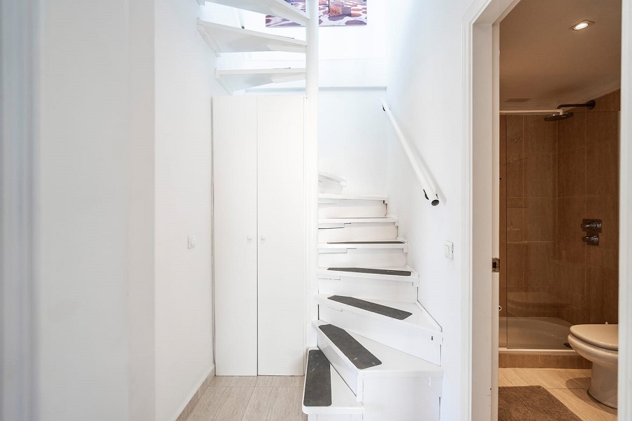Met een wenteltrap gaat u naar de volgende verdieping waar een slaapkamer is met een 2-persoonsbed en airconditioning, een badkamer met bad, toilet, wastafel, wasmachine en droger.